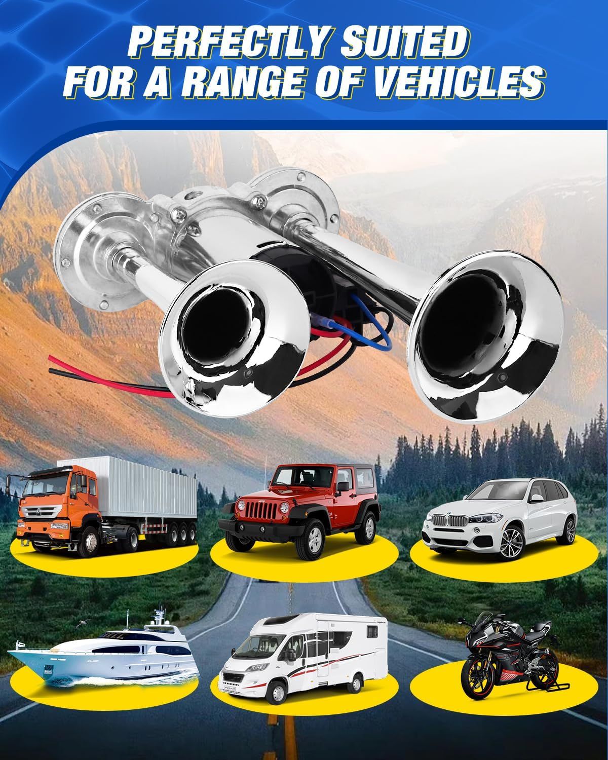 - 【Wide Compatibility】The air horn is compatible with all 12V vehicles, including SUVs, motorcycles, trucks, pickups, trains, yachts, boats, off-road vehicles, buses, and lorries. Whether you aim to enhance vehicle safety or attract attention on special occasions, our horns meet your needs.